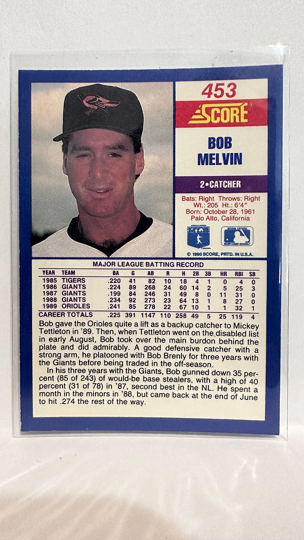 #453 Bob Melvin Baltimore Orioles 1990 Score Baseball Card