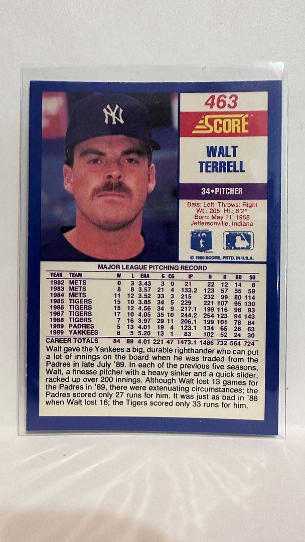 #463 Walt Terrell New York Yankees 1990 Score Baseball Card