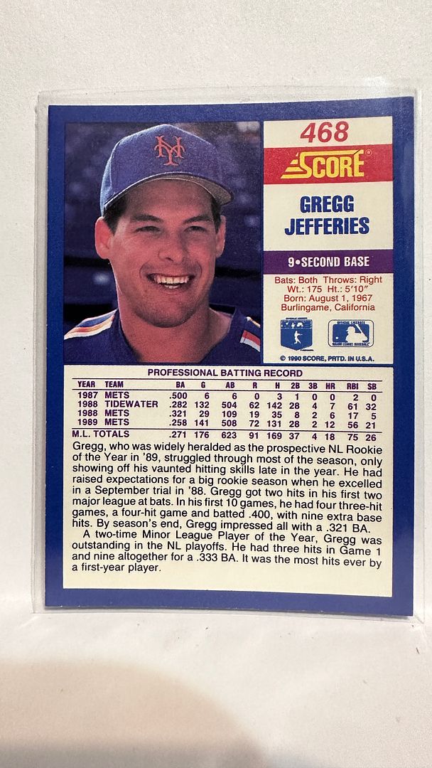 #468 Gregg Jeffries New York Mets 1990 Score Baseball Card