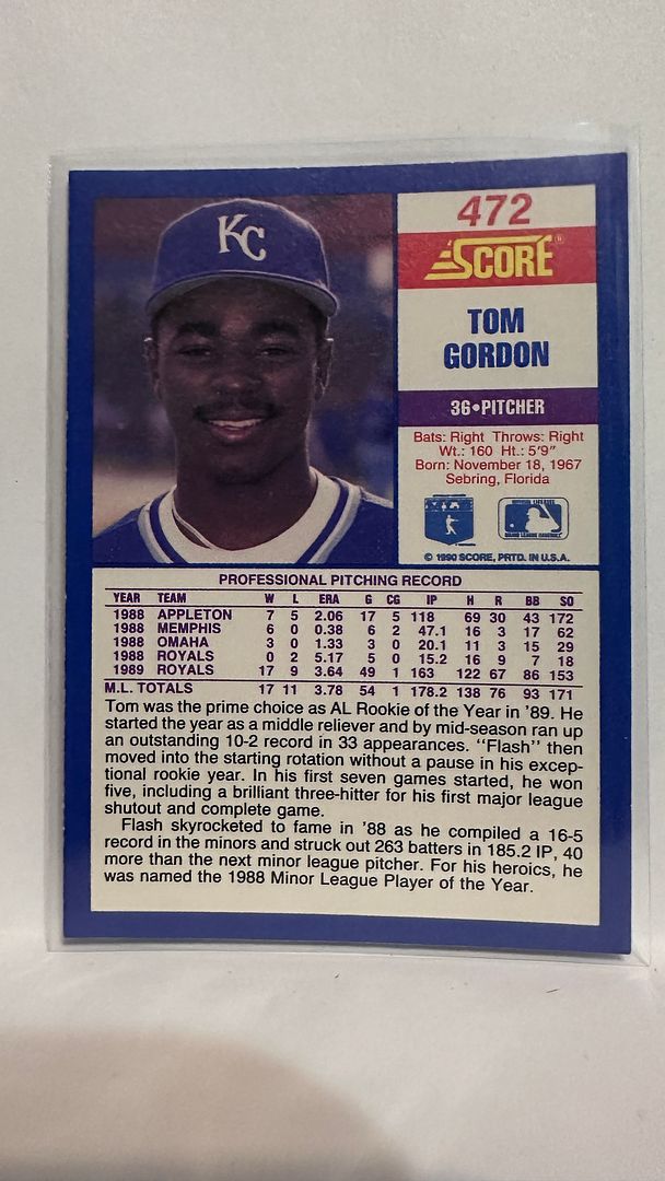 #472 Tom Gordon Kansas City Royals 1990 Score Baseball Card