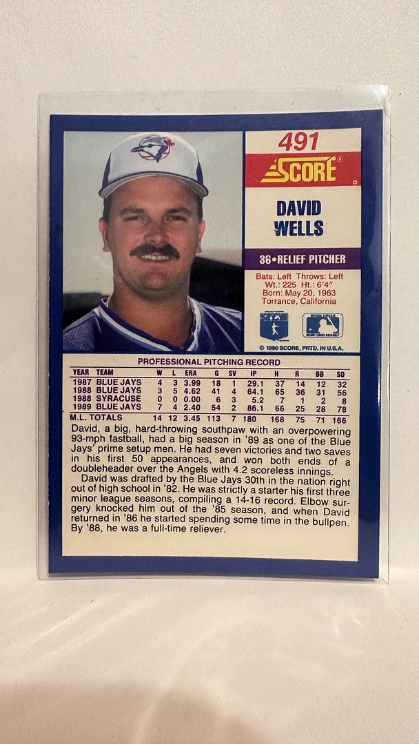 #491 David Wells Toronto Blue Jays 1990 Score Baseball Card