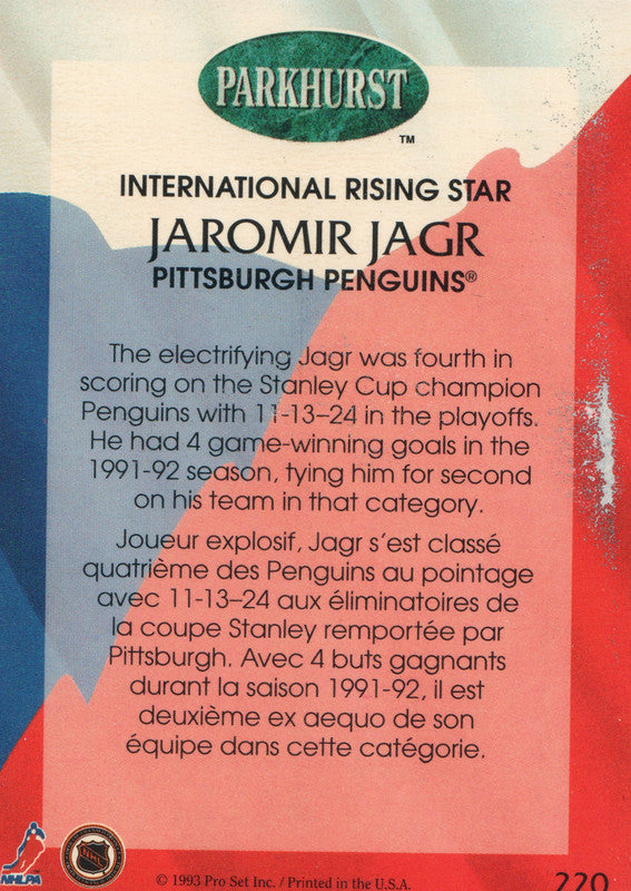 #220 Jaromir Jagr Pittsburgh Penguins 1991-92 Parkhurst Hockey Card OZ