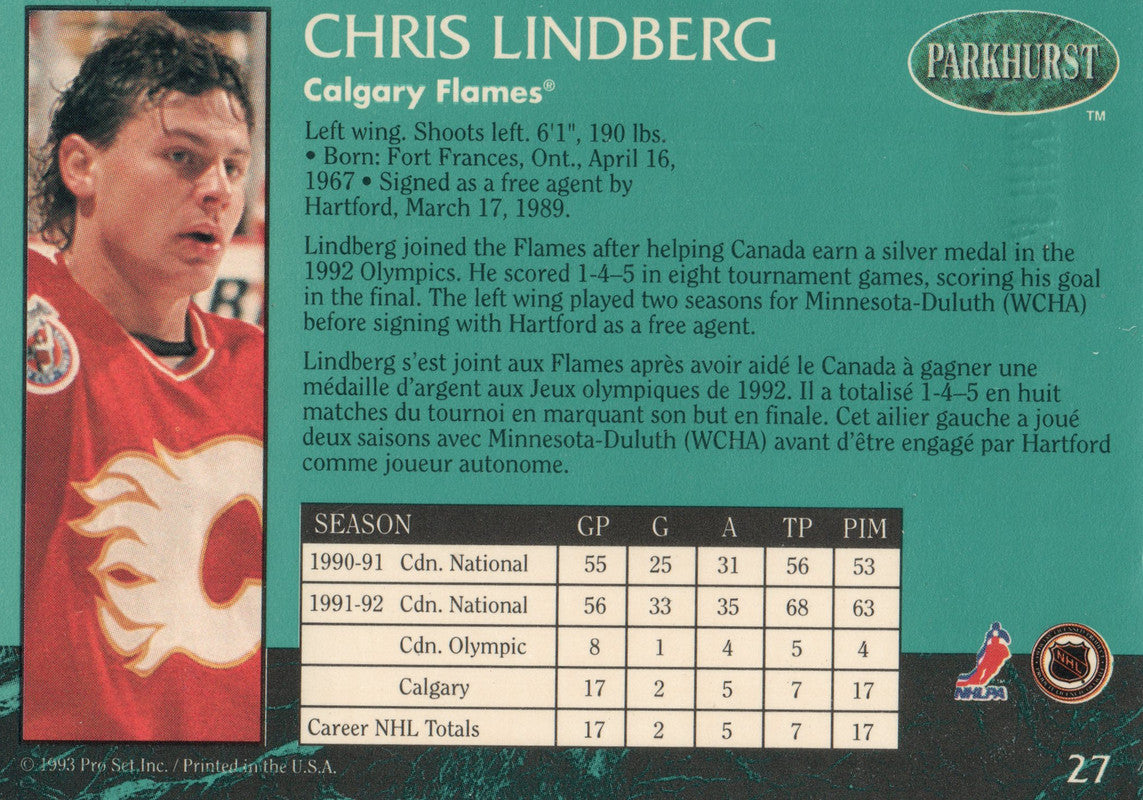#27 Chris Lindberg Calgary Flames 1991-92 Parkhurst Hockey Card OZ