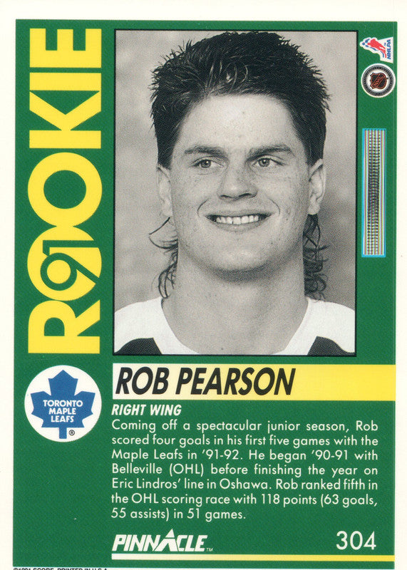 #304 Rob Pearson Rookie Toronto Maple Leafs 1991-92 Pinnacle Hockey Card OU