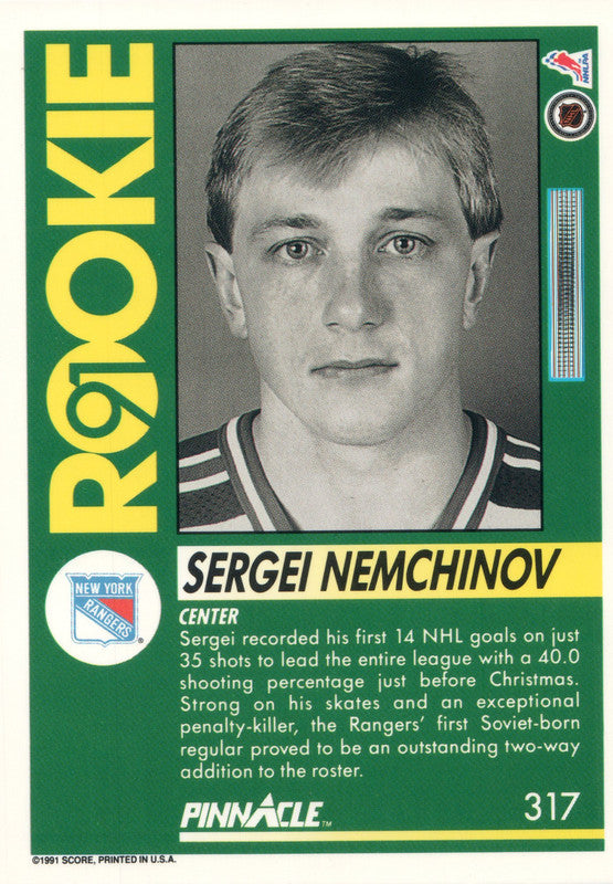 #317 Sergei Nemchinov Rookie New York Rangers 1991-92 Pinnacle Hockey Card OW