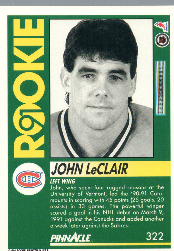 #322 John Leclair Rookie Montreal Canadiens 1991-92 Pinnacle Hockey Card OW