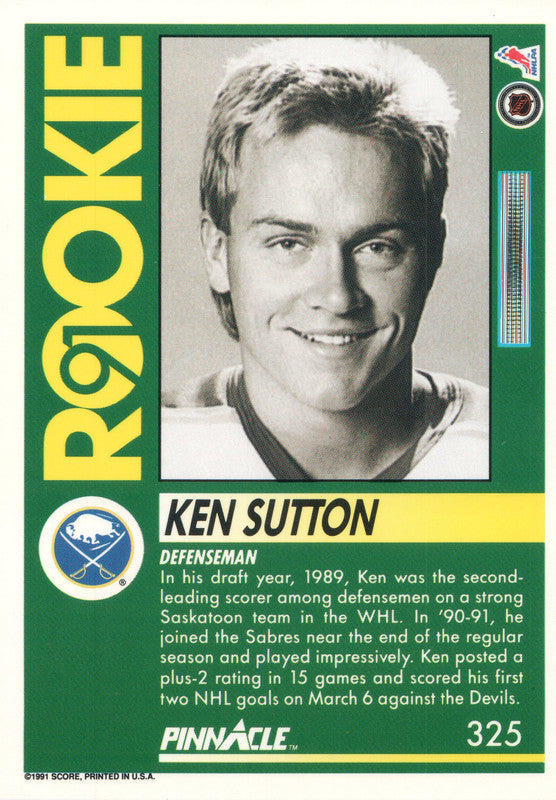 #325 Ken Sutton Rookie Buffalo Sabres 1991-92 Pinnacle Hockey Card OW