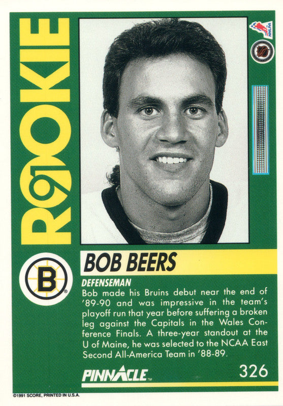 #326 Bob Beers Rookie Boston Bruins 1991-92 Pinnacle Hockey Card OW