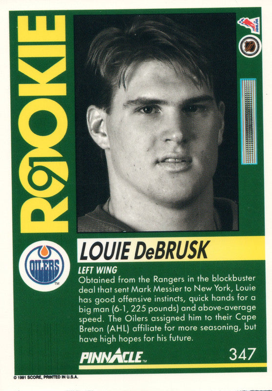 #347 Louie Debrusk Rookie Edmonton Oilers 1991-92 Pinnacle Hockey Card OV