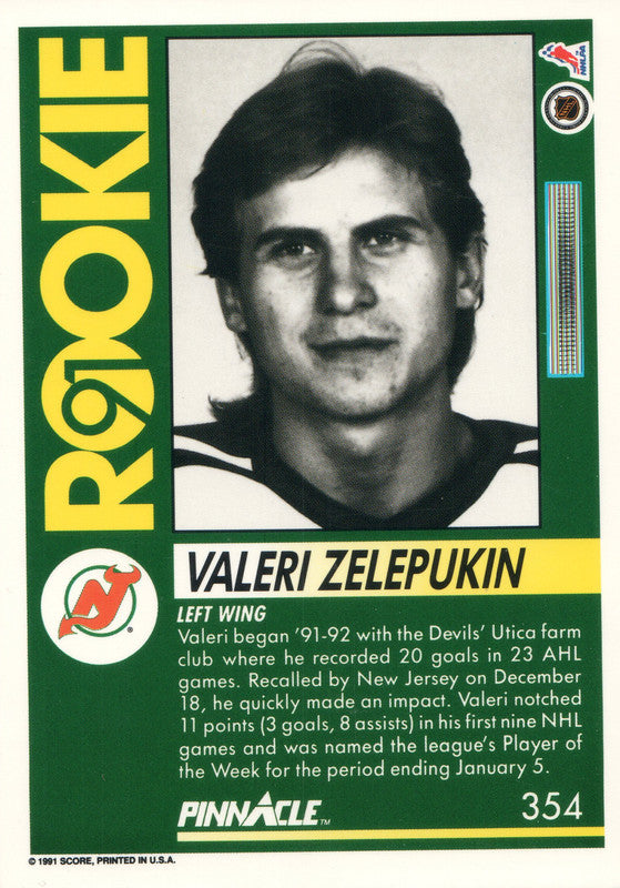 #354 Valeri Zelepukin Rookie New Jersey Devils 1991-92 Pinnacle Hockey Card OV