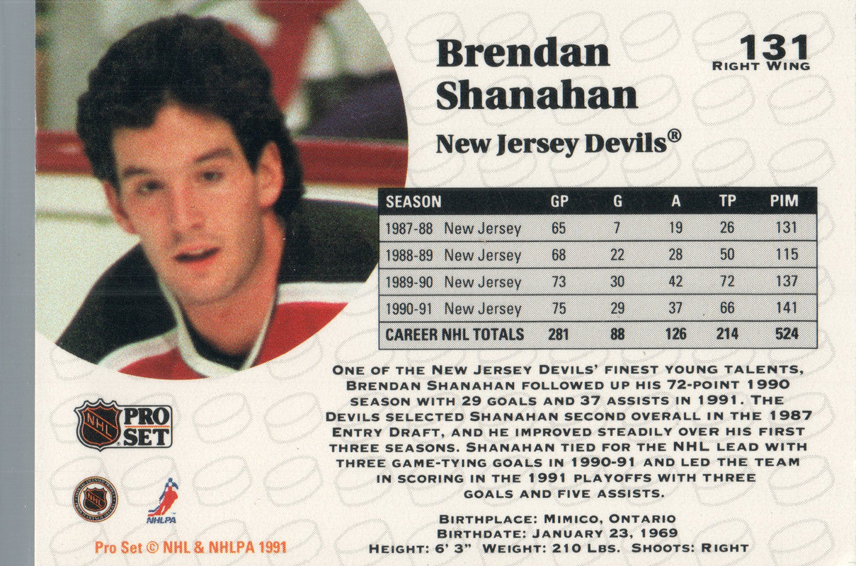 #131 Brendan Shanahan New Jersey Devils 1991-92 Pro Set Hockey Card