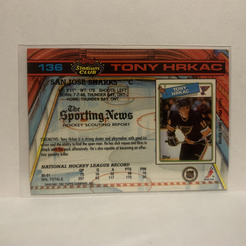 #136 Tony Hrkac San Jose Sharks 1991-92 Topps Stadium Club Hockey Card JV
