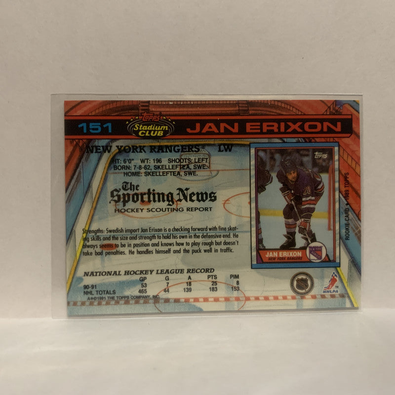 #151 Jan Erixon New York Rangers 1991-92 Topps Stadium Club Hockey Card JW