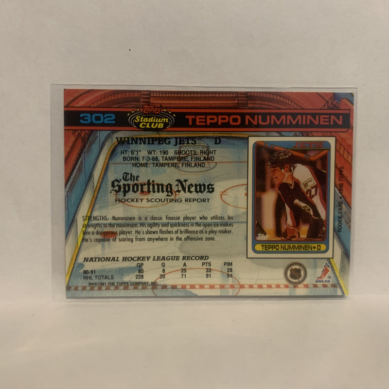 #302 Teppo Numminen Winnipeg Jets 1991-92 Topps Stadium Club Hockey Card LZ4
