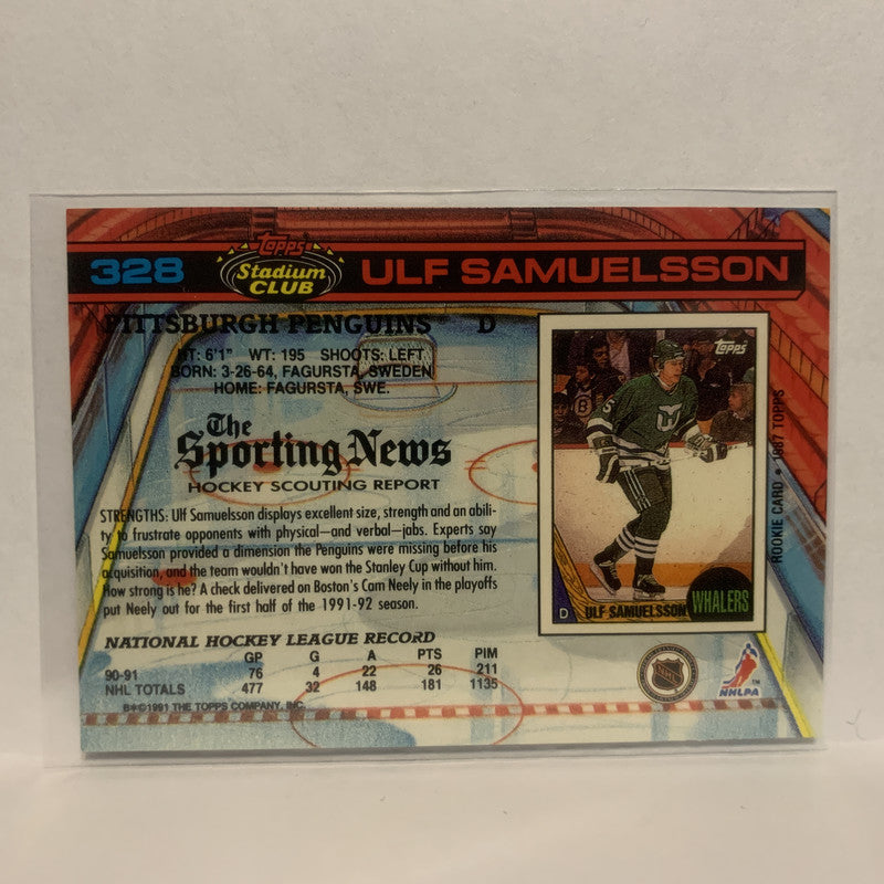 #328 Ulf Samuelsson Pittsburgh Penguins 1991-92 Topps Stadium Club Hockey Card LO