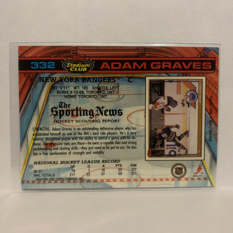 #332 Adam Graves New York Rangers 1991-92 Topps Stadium Club Hockey Card LN