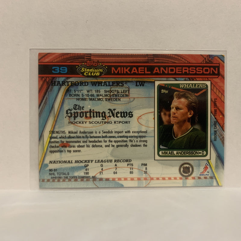 #39 Mikael Andersson Hartford Whalers 1991-92 Topps Stadium Club Hockey Card JX