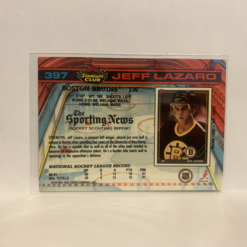 #397 Jeff Lazaro Boston Briuns 1991-92 Topps Stadium Club Hockey Card LZ4