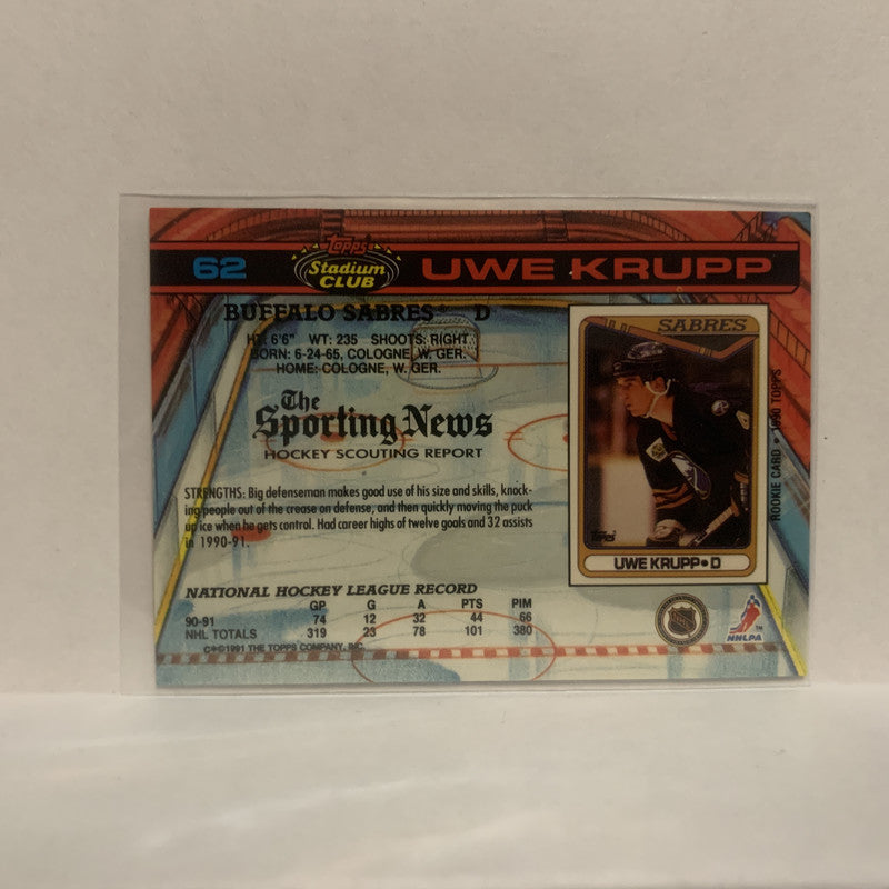 #62 Uwe Krupp Buffalo Sabres 1991-92 Topps Stadium Club Hockey Card JU
