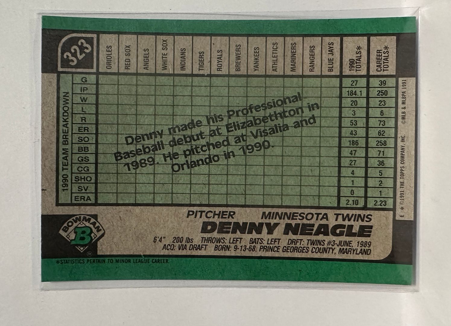 #323 Denny Neagle Minnesota Twins 1991 Bowman Baseball Card