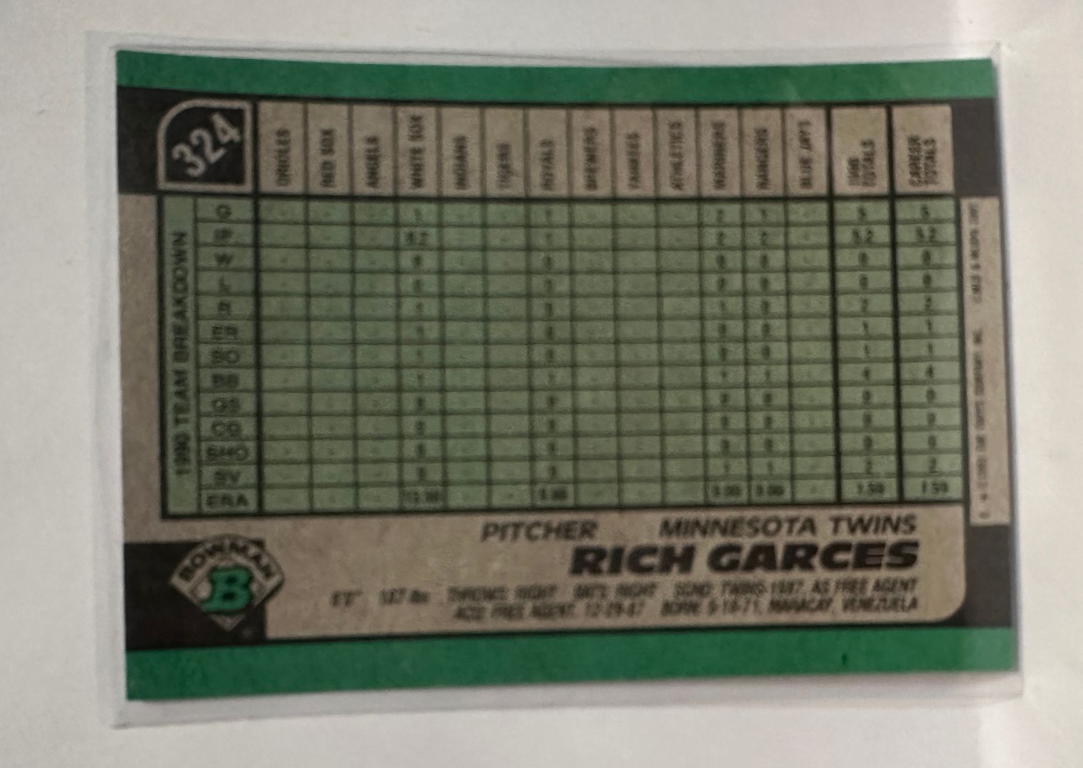 #324 Rich Garces Minnesota Twins 1991 Bowman Baseball Card