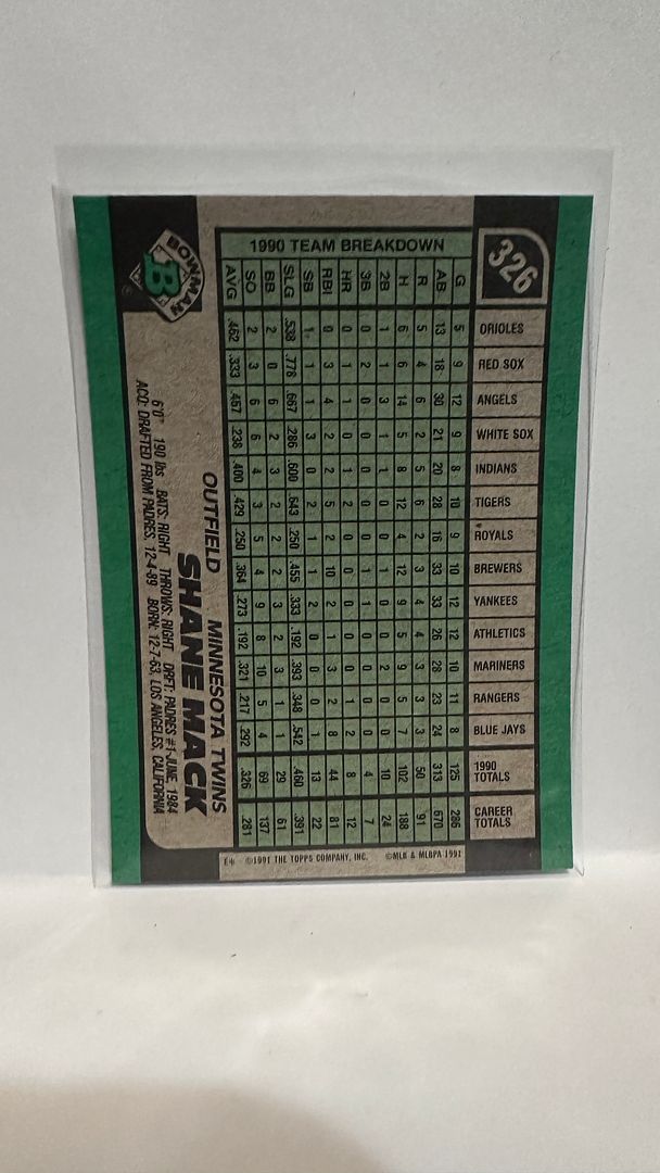 #326 Shane Mack Minnesota Twins 1991 Bowman Baseball Card