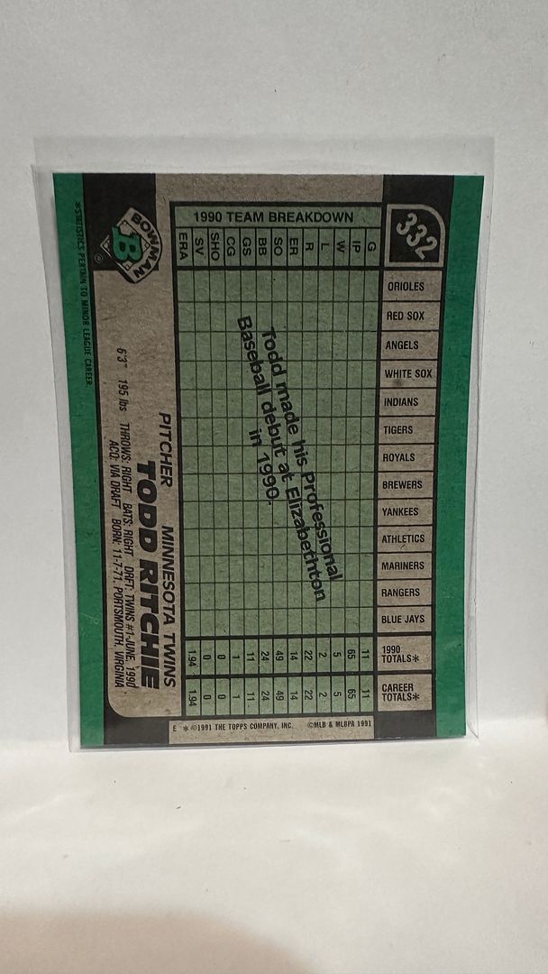 #332 Todd Ritchie Minnesota Twins 1991 Bowman Baseball Card