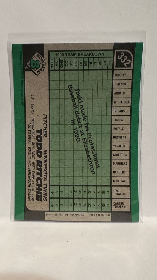 #332 Todd Ritchie Minnesota Twins 1991 Bowman Baseball Card