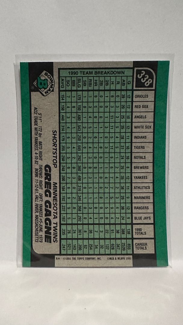 #338 Greg Gagne Minnesota Twins 1991 Bowman Baseball Card