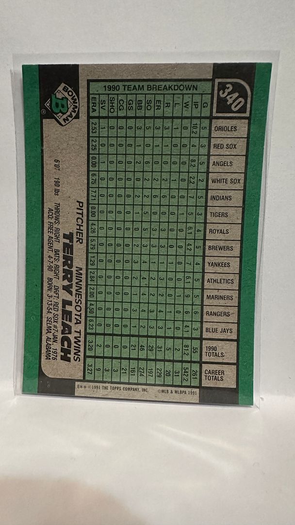 #340 Terry Leach Minnesota Twins 1991 Bowman Baseball Card
