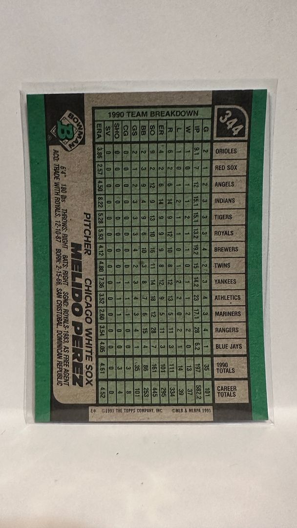 #344 Melido Perez Chicago White Sox 1991 Bowman Baseball Card