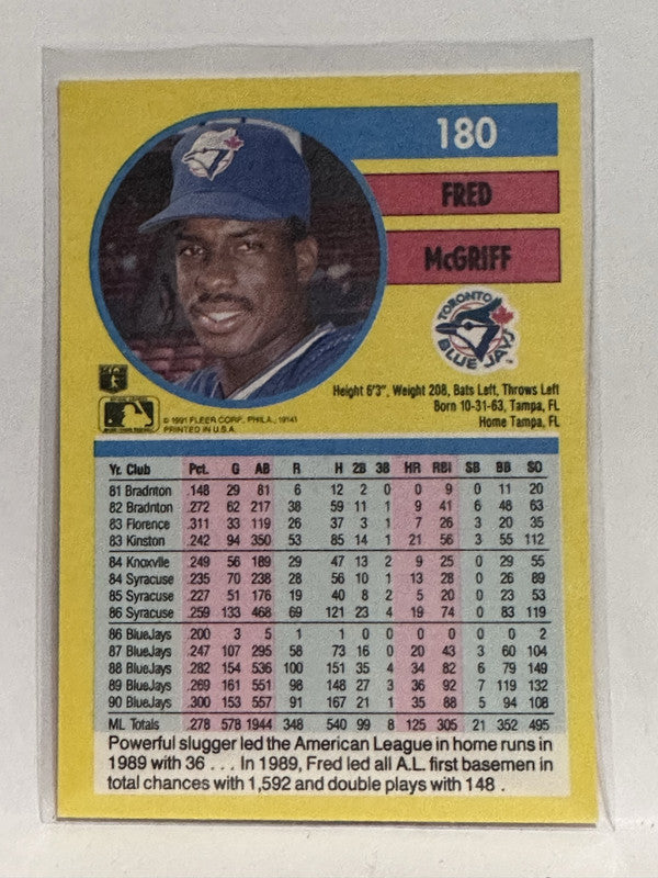 #180 Fred McGriff Toronto Blue Jays 1991 Fleer Baseball Card