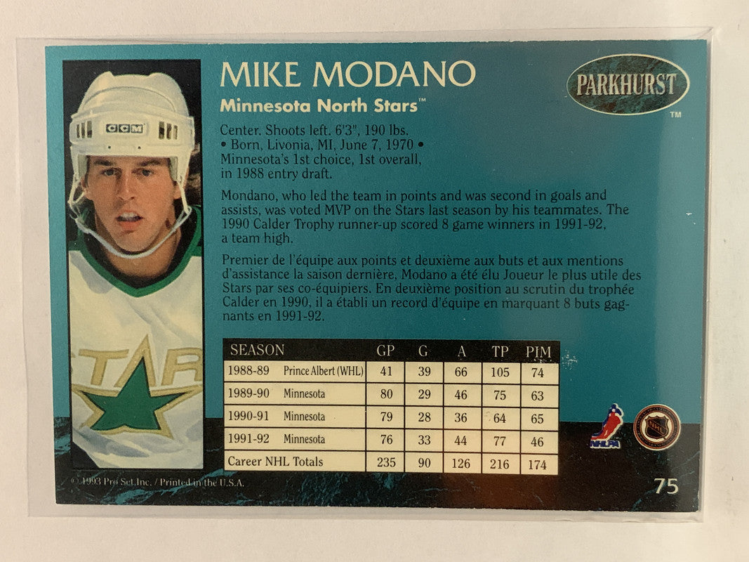 #75 Mike Modano Minnesota North Stars 1992-93 Parkhurst Hockey Card NHL