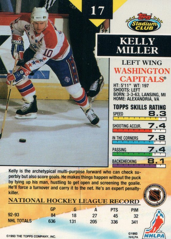 #17 Kelly Miller Washington Capitals 1992-93 Topps Stadium Club Hockey Card OW