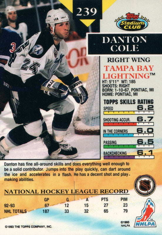 #239 Danton Cole Tampa Bay Lightning 1992-93 Topps Stadium Club Hockey Card OX