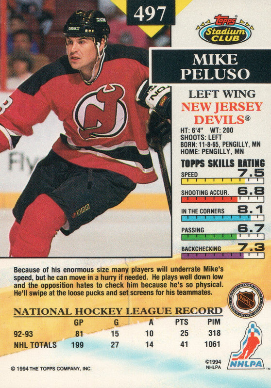 #497 Mike Peluso New Jersey Devils 1992-93 Topps Stadium Club Hockey Card OX