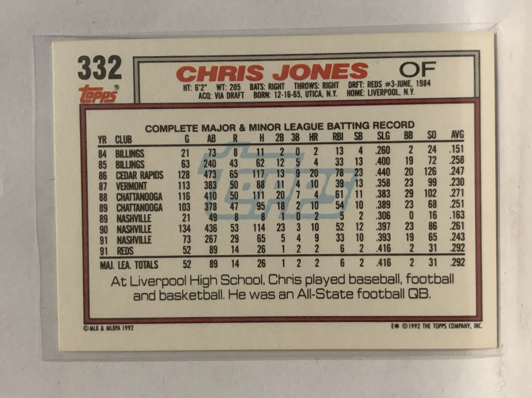 #332 Chris Jones Boston Red Sox 1992 Topps Baseball Card