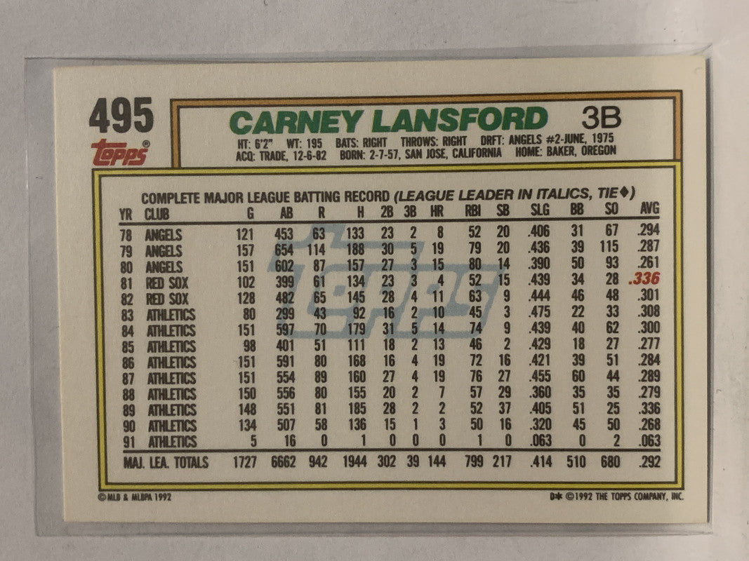 #495 Carney Lansford Oakland Athletics 1992 Topps Baseball Card