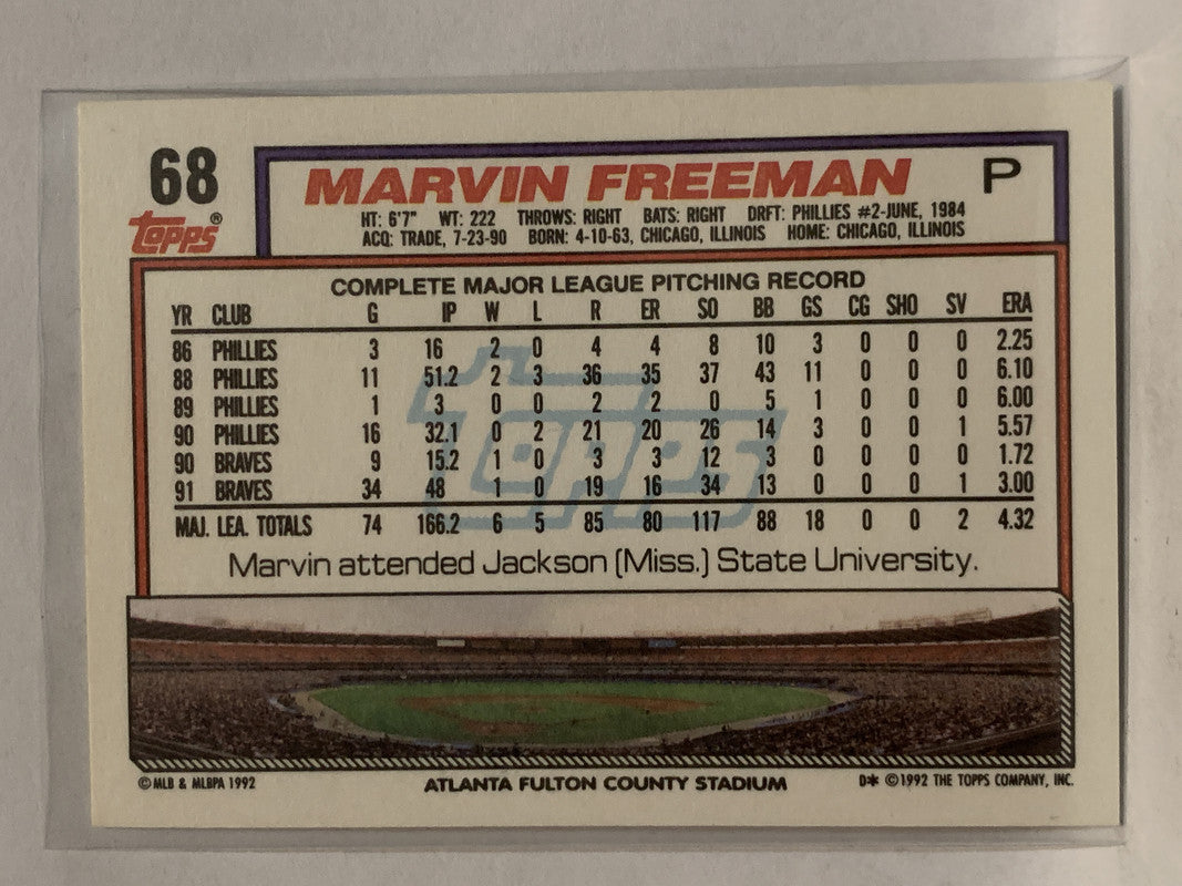 #68 Marvin Freeman Atlanta Braves 1992 Topps Baseball Card