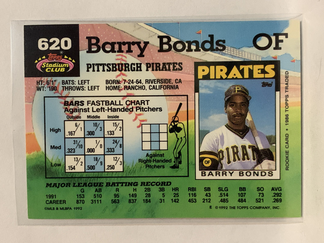 #620 Barry Bonds Pittsburgh Pirates 1992 Topps Stadium Club Baseball Card