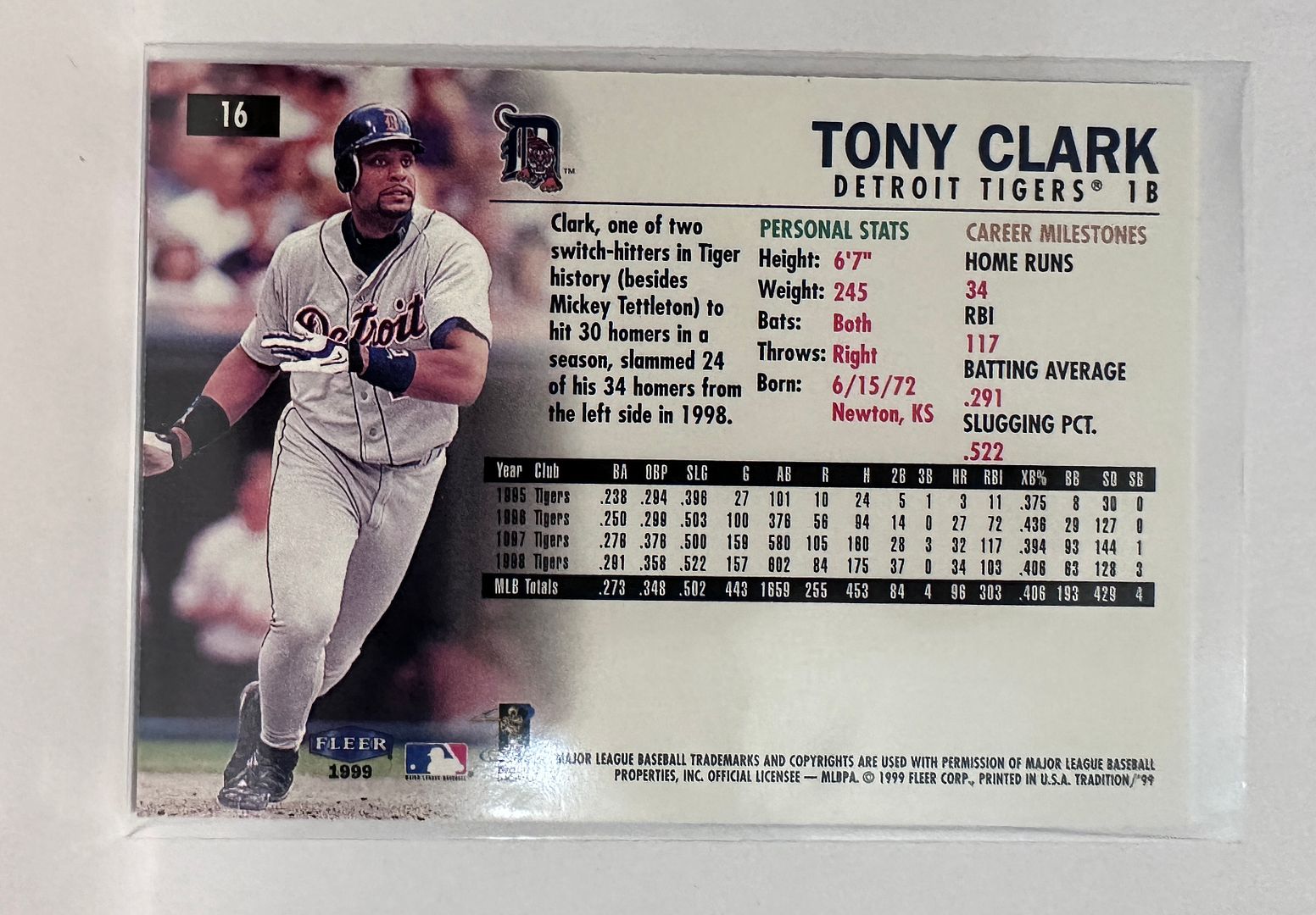 #16 Tony Clark Detroit Tigers 1999 Fleer Tradtion Baseball Card