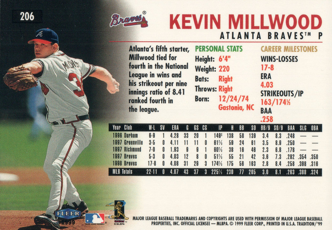 #206 Kevin Millwood Atlanta Braves 1999 Fleer Tradition Baseball Card OB