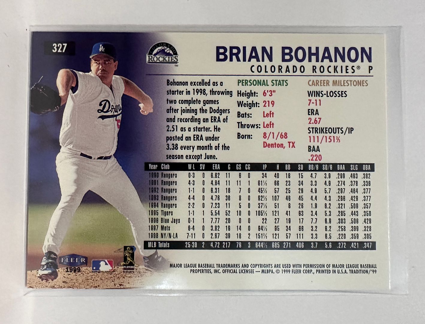 #327 Brian Bohanon Colorado Rockies 1999 Fleer Tradtion Baseball Card