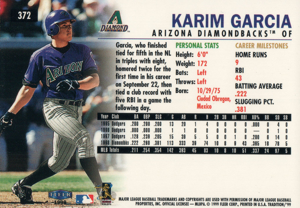 #372 Karim Garcia Arizona Diamondbacks 1999 Fleer Tradition Baseball Card OB