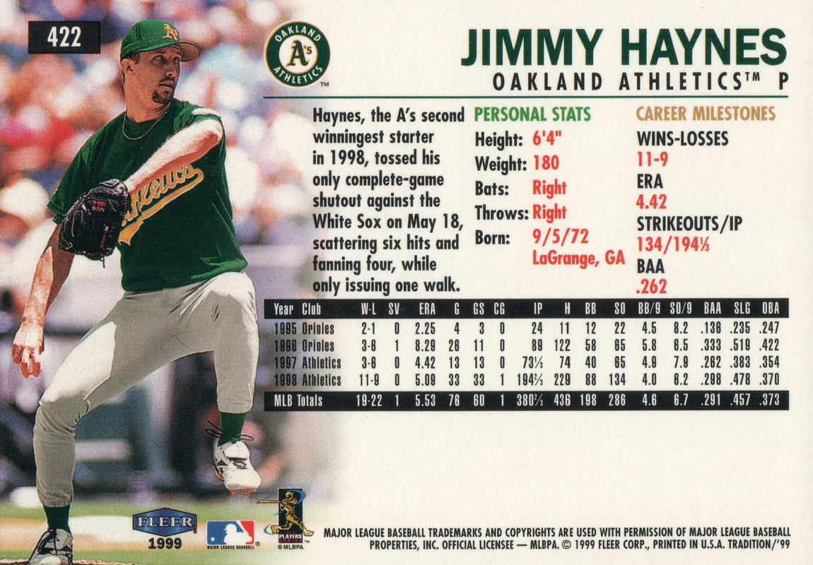 #422 Jimmy Haynes Oakland Athletics 1999 Fleer Tradition Baseball Card OC