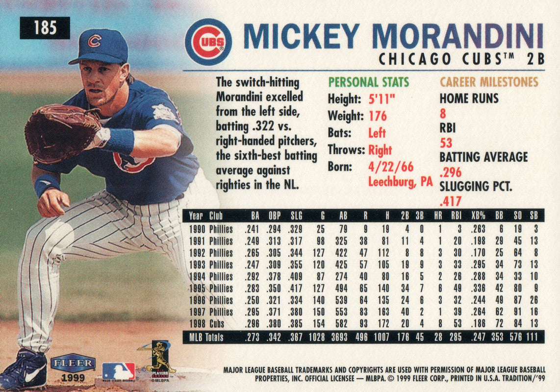 #185 Mickey Morandini Chicago Cubs 1999 Fleer Tradition Baseball Card OC