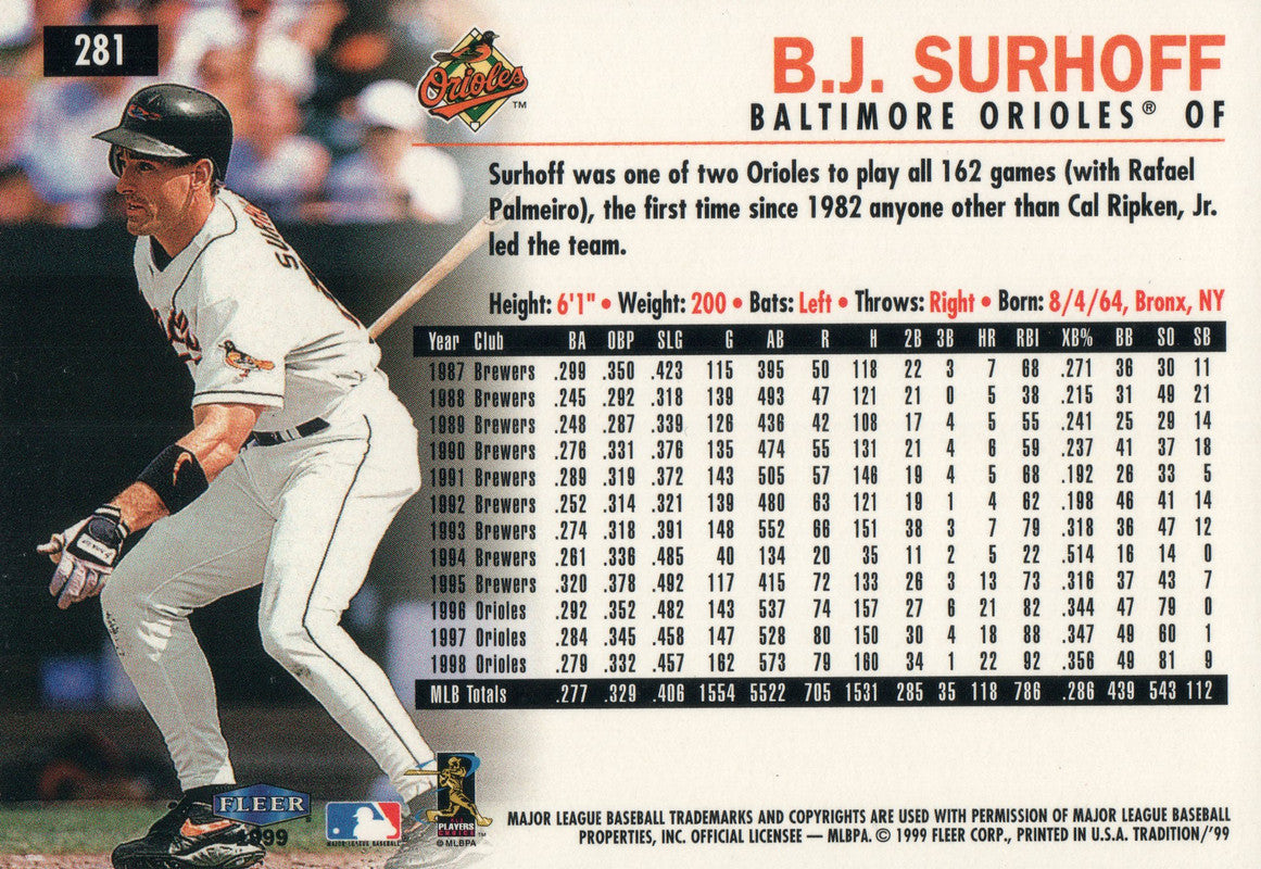 #281 B.J. Surhoff Baltimore Orioles 1999 Fleer Tradition Baseball Card OC
