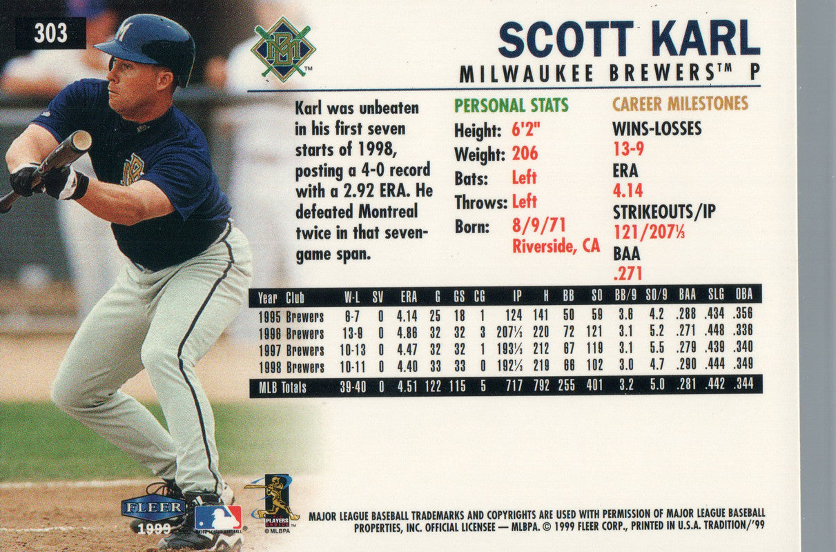 #303 Scott Karl Milwaukee Brewers 1999 Fleer Tradition Baseball Card OC