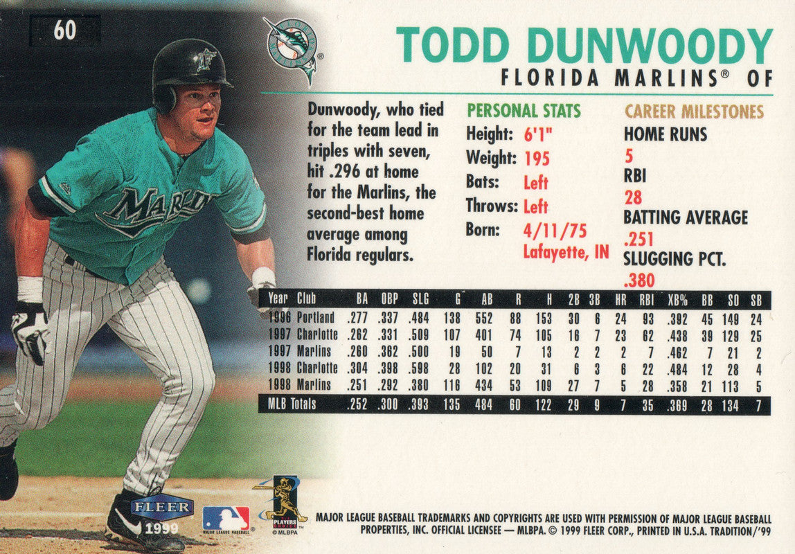#60 Todd Dunwoody Florida Marlins 1999 Fleer Tradition Baseball Card OC