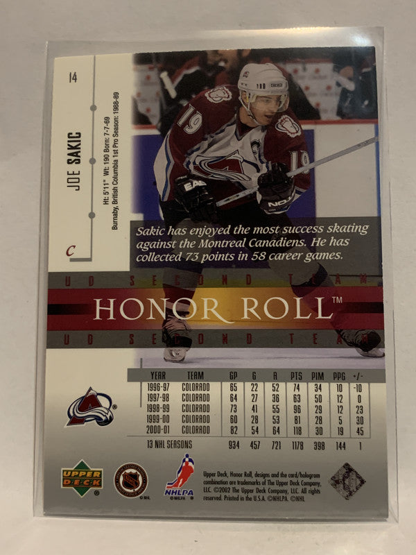 #14 Joe Sakic Honor Roll Colorado Avalanche 2001-02 Upper Deck Hockey Card NHL
